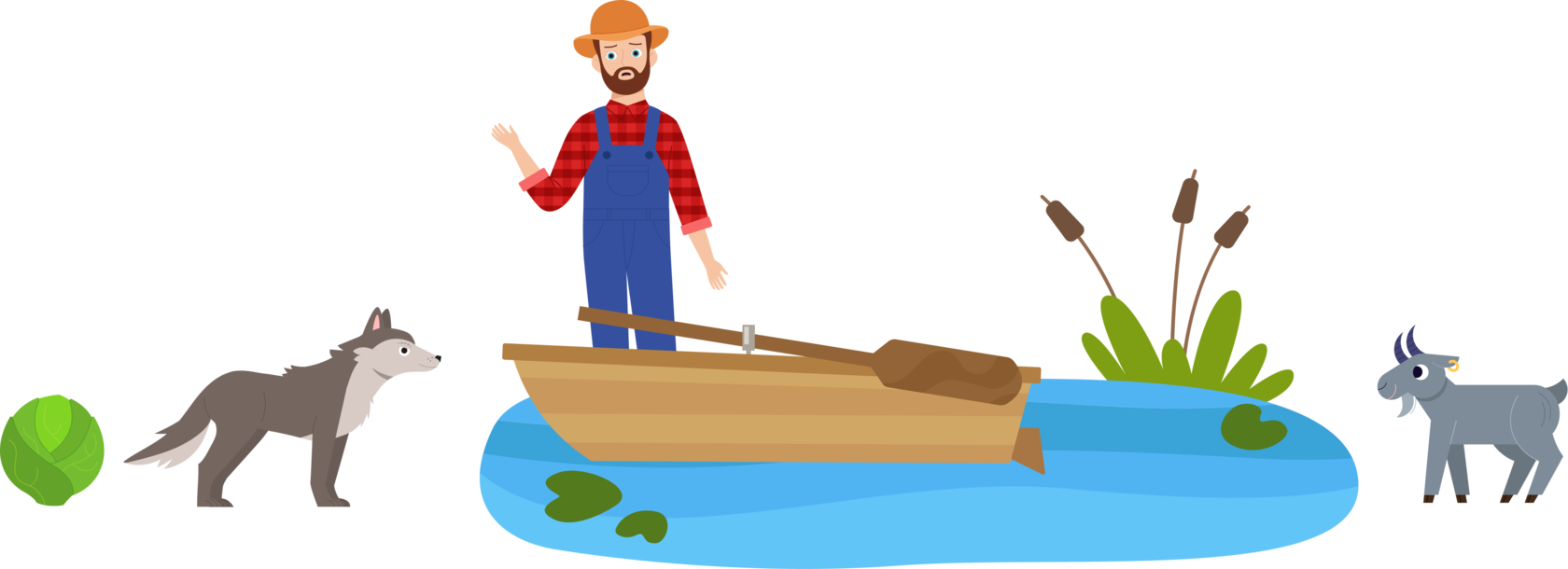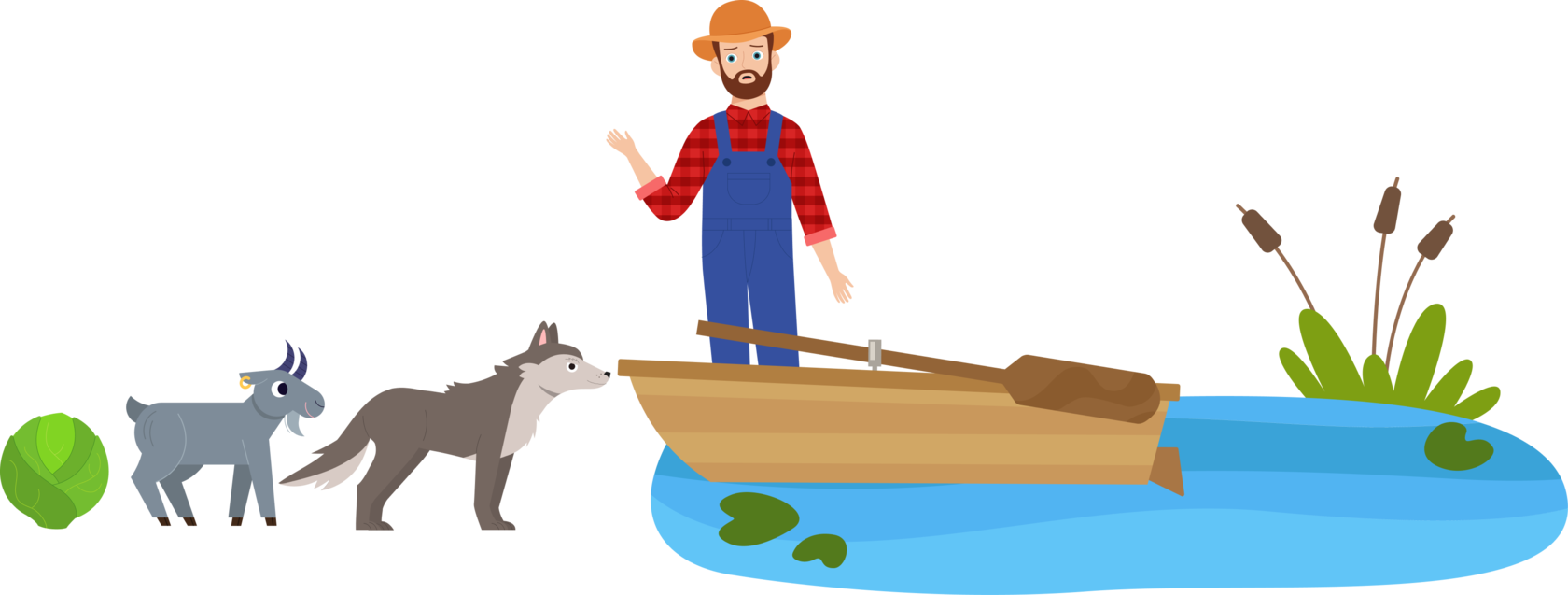 • Сначала кажется, что фермер может переправлять каждый предмет друг за другом в произвольном порядке. Но давайте представим, что такая ситуация приключилась с вами в реальной жизни. Волк — хищник, а коза — травоядное животное. И если оставить волка с козой наедине, волк съест козу. А если оставить козу с капустой — прощай, капуста.