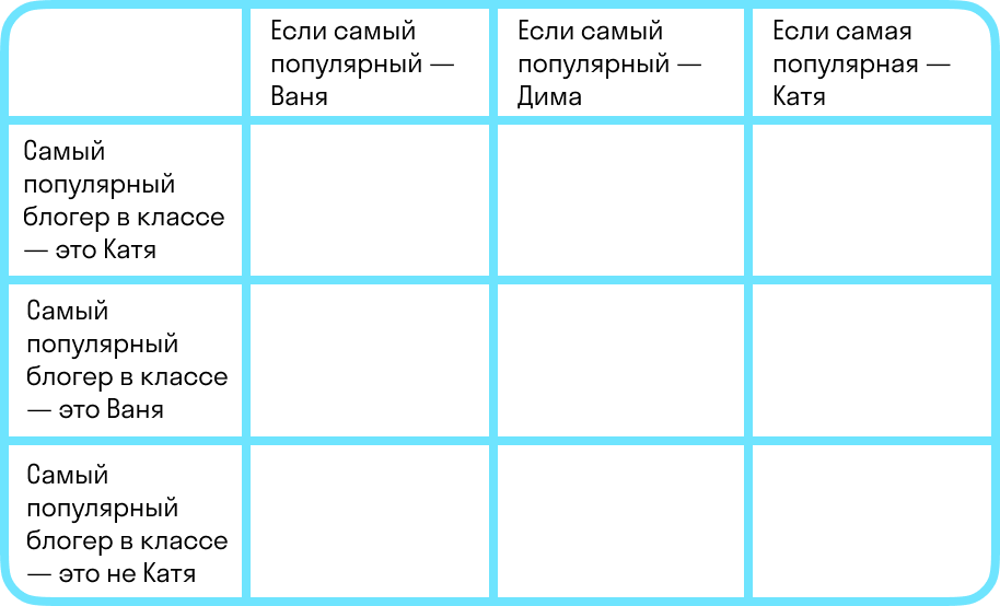 Теперь проверяем эти утверждения для каждого из ребят по очереди, начиная с Вани. Предположим, что Ваня — самый популярный блогер в классе. Сопоставим этот факт с тремя утверждениями. Если Ваня на самом деле самый популярный, то утверждение: «Самый популярный блогер в классе — это Катя» ложное. А вот второе и третье утверждения — правда. Записываем все это в первый столбец.