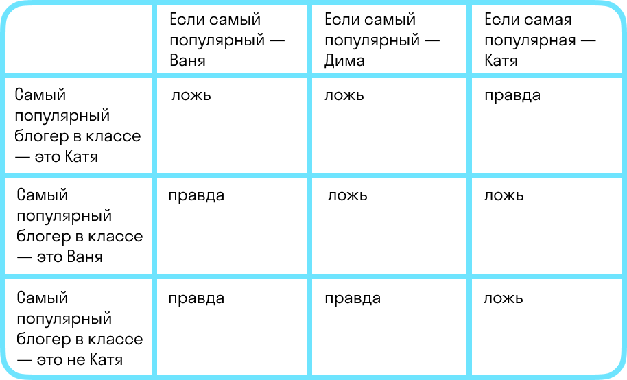 Теперь возвращаемся к условию. Правдой должны быть два из трех утверждений в столбце. Значит, верный — первый столбец (потому что в остальных двух правдивое утверждение только одно). Получается, самый популярный блогер в классе — Ваня.